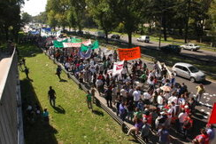 Cerca de las 12 del mediodía, comenzó el corte de la arteria principal de la Gral. Paz, dejando un carril libre para la circulación de los vehículos, a los que se repartieron volantes explicando los motivos de la protesta. El corte incluyó una marcha de casi un kilómetro hasta el predio del INTI, donde a partir de las 13 hs. se realizó el acto de cierre con la palabra de los referentes de las distintas organizaciones.