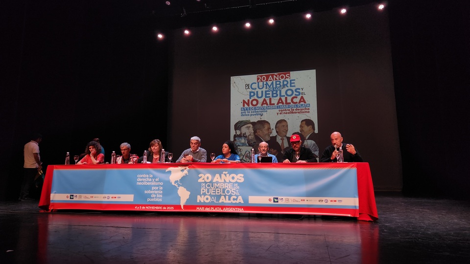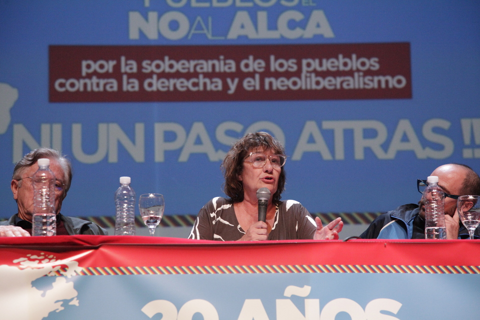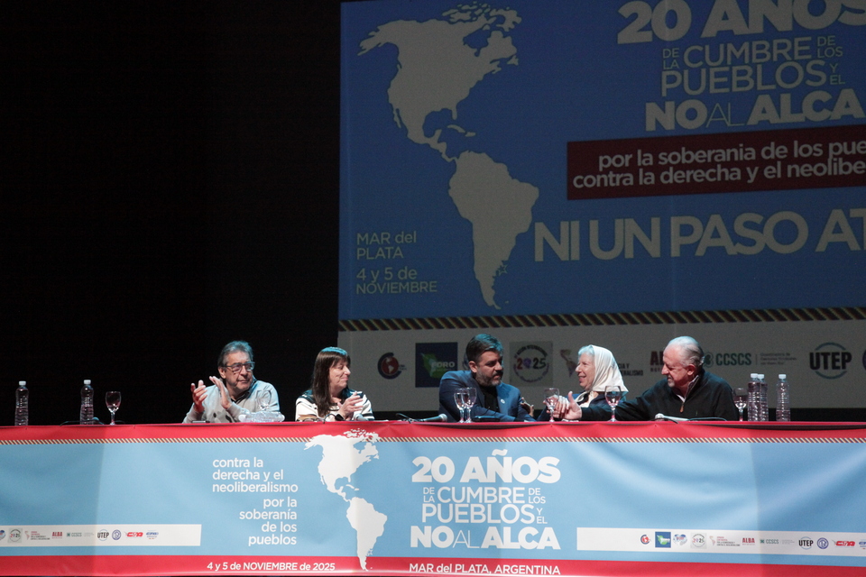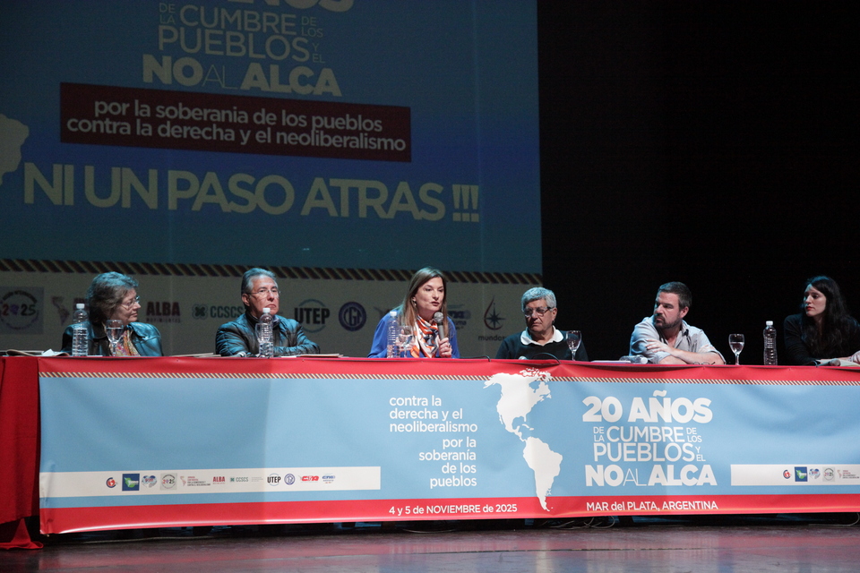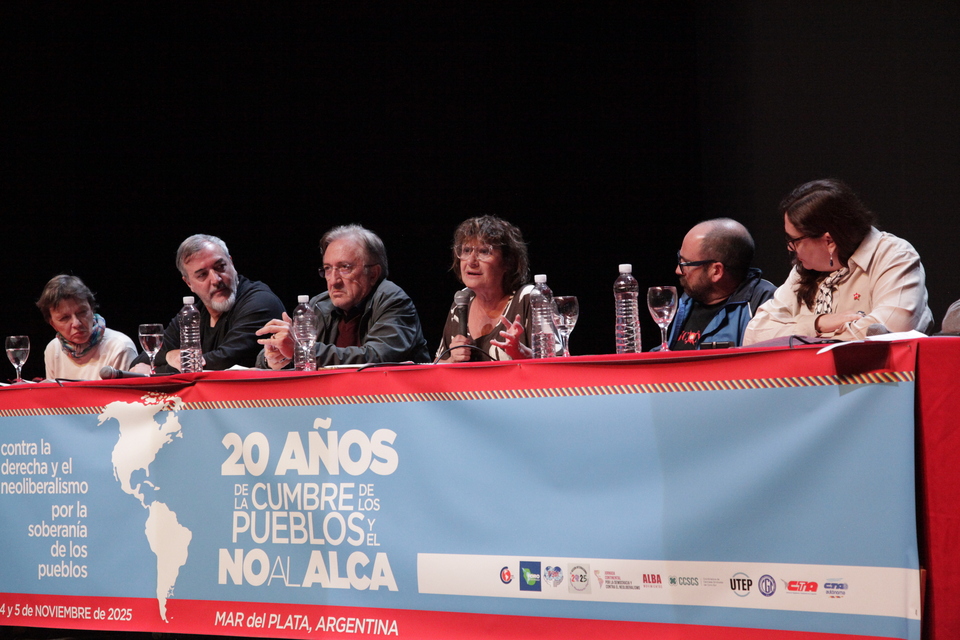 La primera mesa de reflexión y debate sobre el "Significado histórico de los 20 años del No al ALCA" tuvo las exposiciones de Héctor de la Cueva (CILAS - México), Víctor De Gennaro (CTA-A), Manuel Bertoldi (ALBA Movimientos), Beverly Keene (Jornada Continental) y Estela Díaz (Min. de Mujeres y Diversidad - PBA), con la moderación de Marina Cardelli (UTEP).