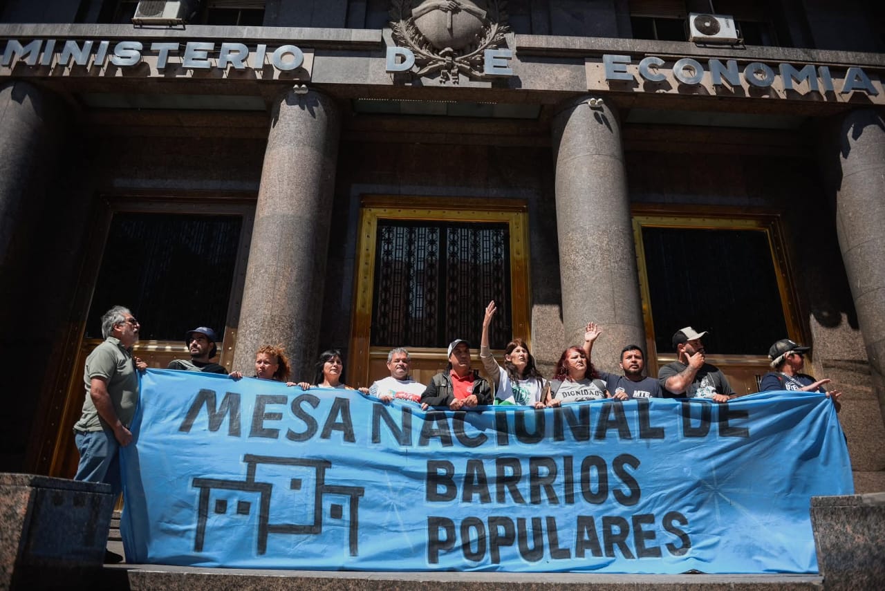 Las organizaciones sociales que integramos la Mesa Nacional de Barrios Populares nos movilizamos este 14 de octubre al Ministerio de Economía para reclamar los pagos pendientes de las obras de integración socio-urbana en nuestras barriadas, que continúan deteriorándose mientras las familias sufren la desidia de un gobierno que elige beneficiar a unos pocos poderosos y desfinancia las obras de infraestructura básica.