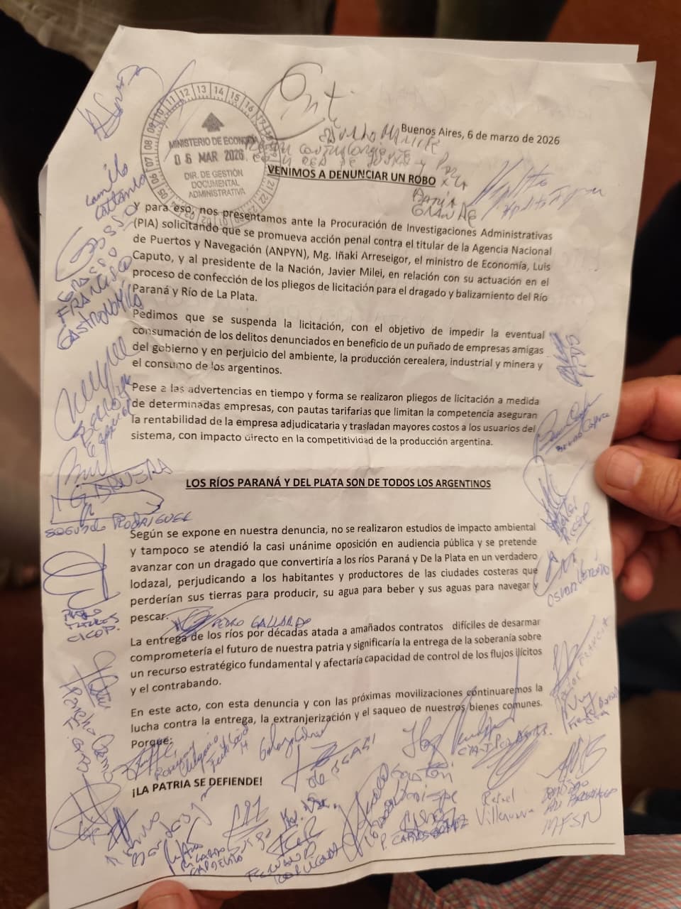Los convocantes expresamos nuestra preocupación ante la posibilidad de que la administración y el control de la principal vía navegable del país queden en manos privadas, violando la soberanía nacional. Señalamos que el Río Paraná y el Río de la Plata constituyen recursos estratégicos para el desarrollo económico, la soberanía nacional y el comercio exterior argentino.